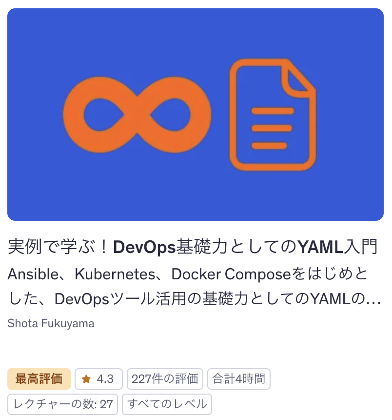 プログラミング初心者でコードを書くのにまだ慣れていない方は「実例で学ぶ!DevOps基礎力としてのYAML入門」も受講しておくのもありかと。
