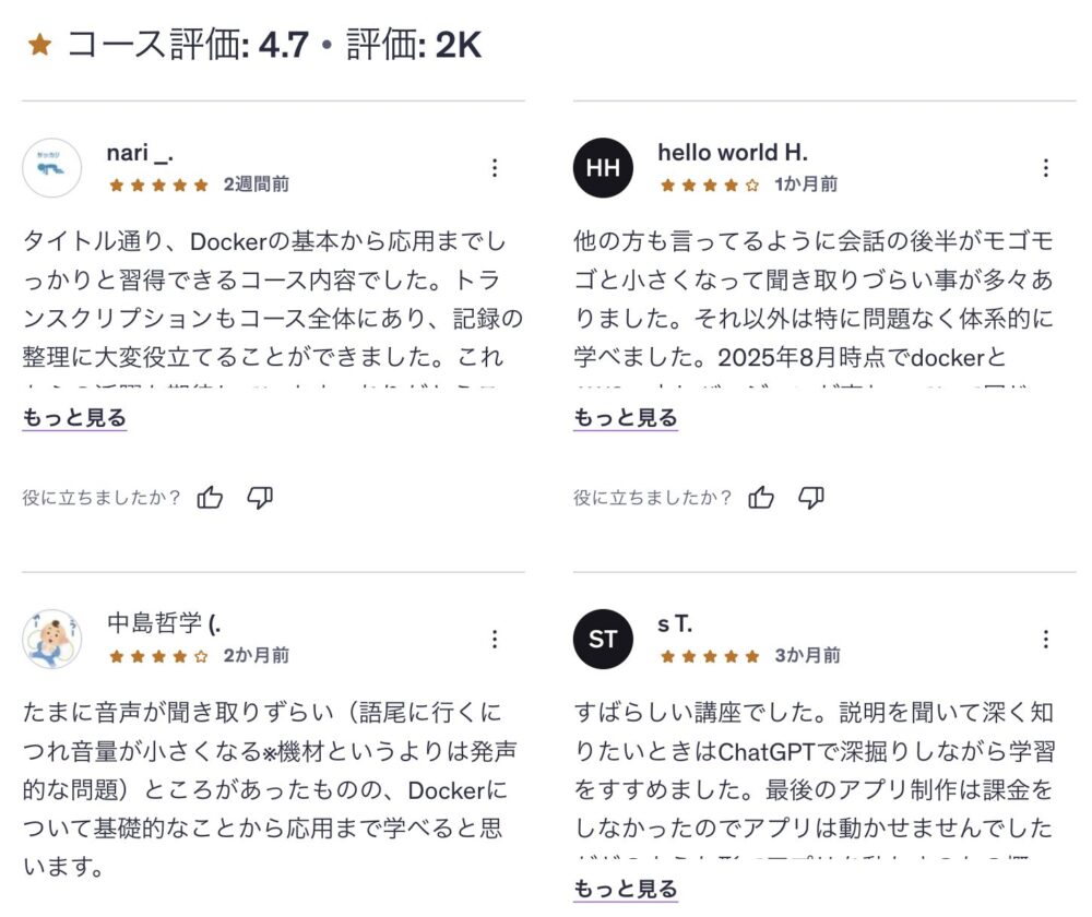 Dockerを活用したCI/CDパイプラインの構築なども学べるので、内容は濃いですが一通り手を動かしながら受講すると理解が深まると思います。