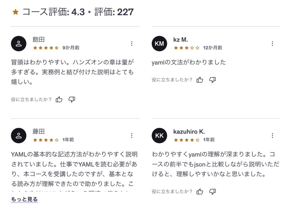 こちらの講座はYAMLの基礎が学べます。