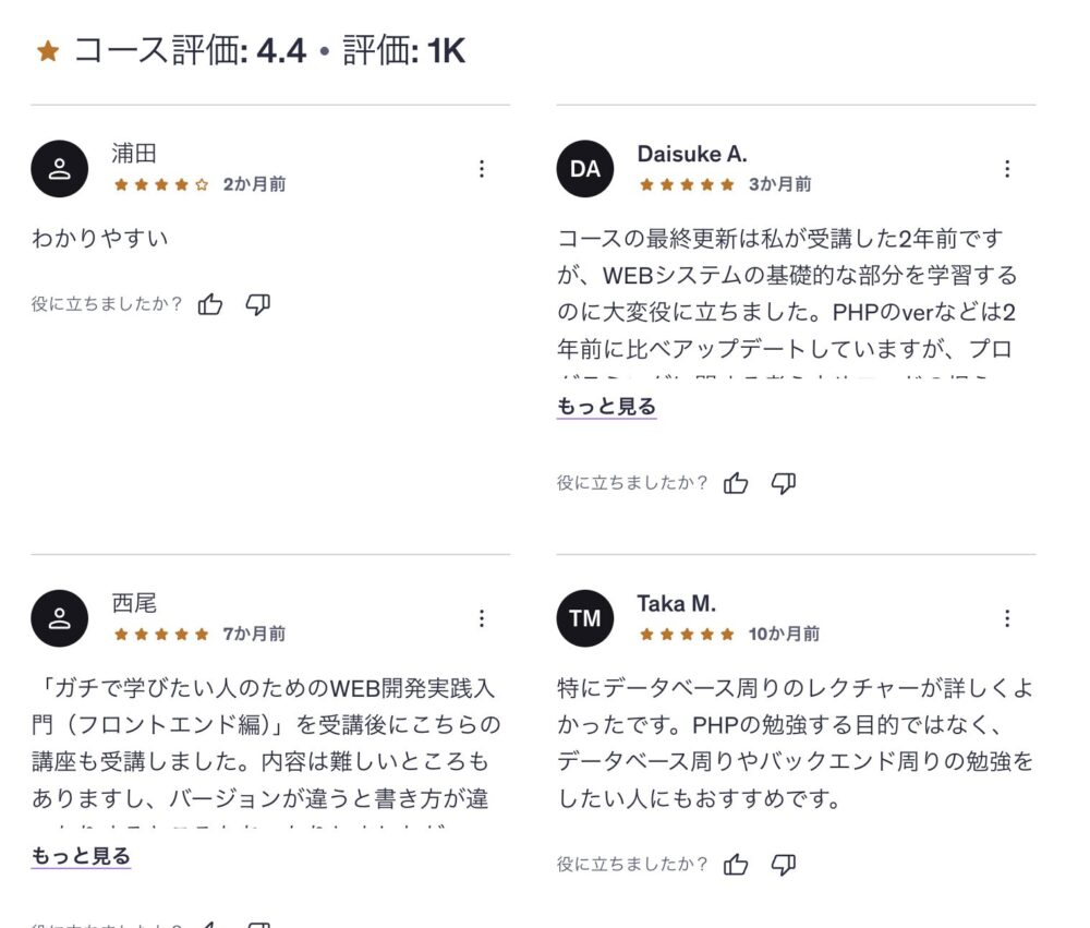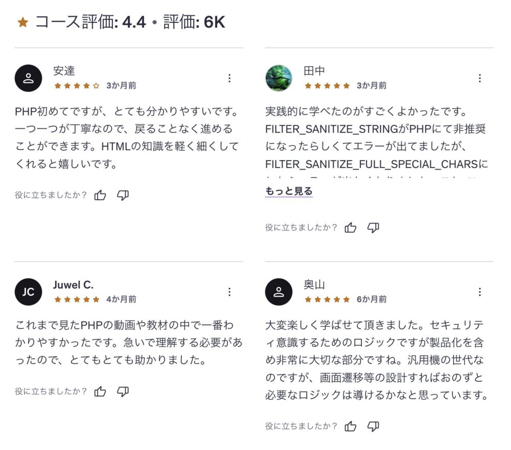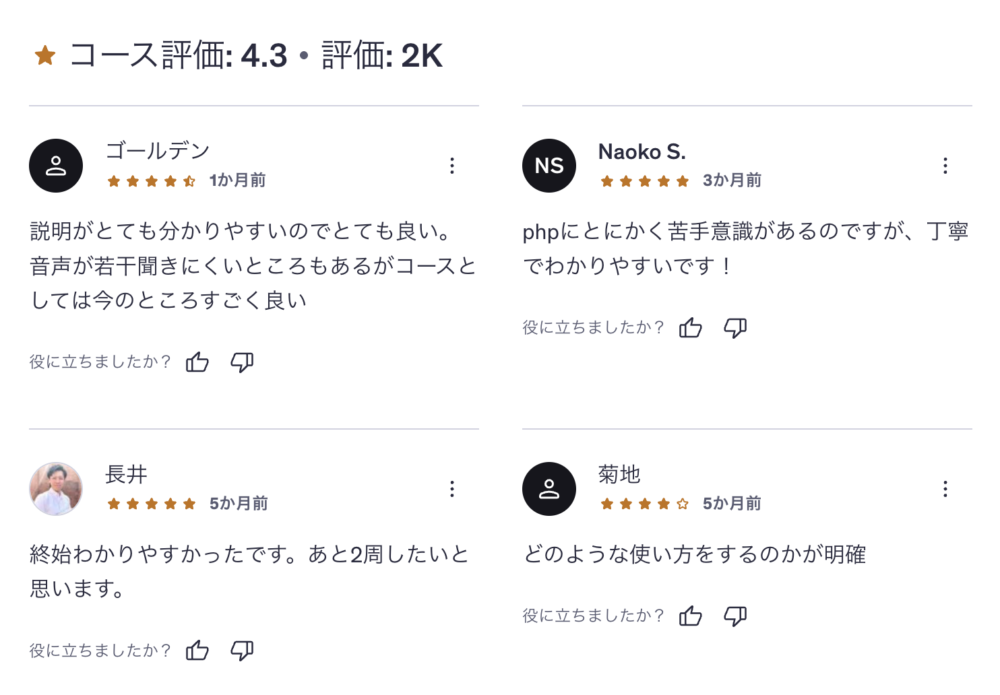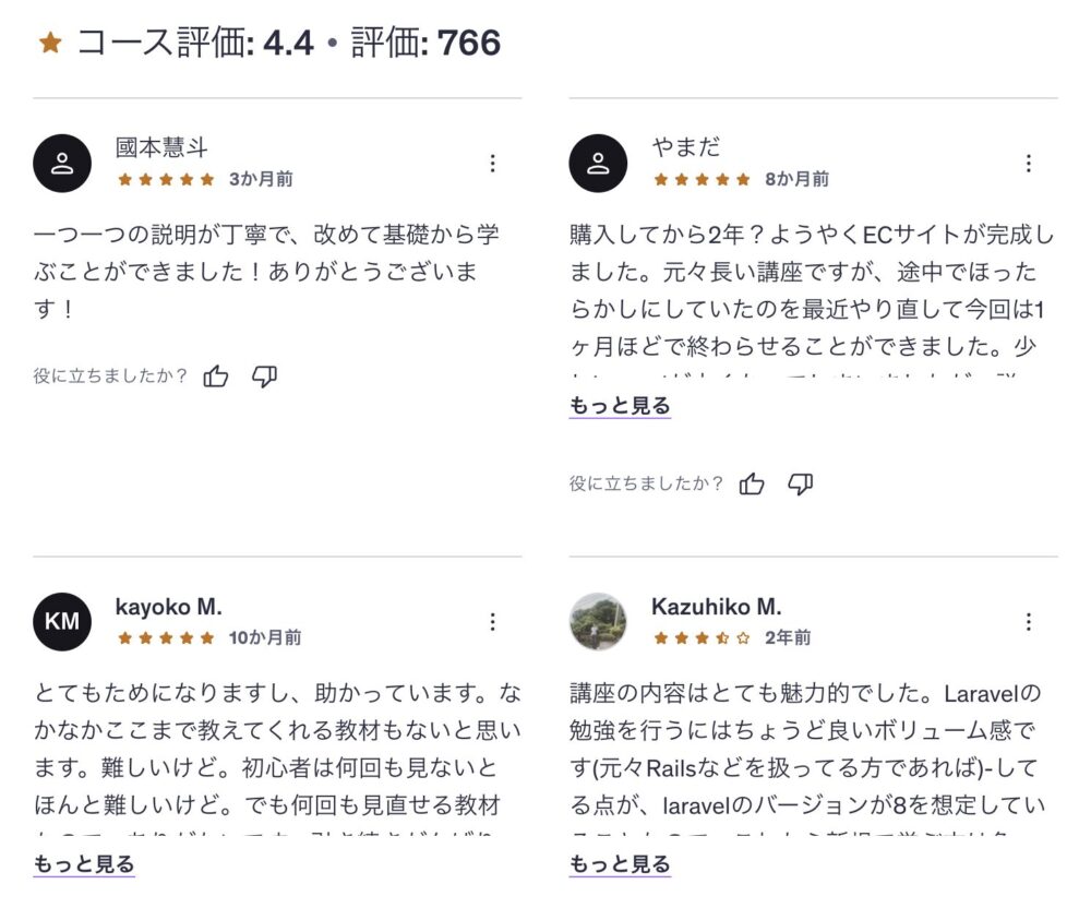 Laravelについては4つの講座をお伝えしますが、どの講座も購入者からの評価がかなり高いです。