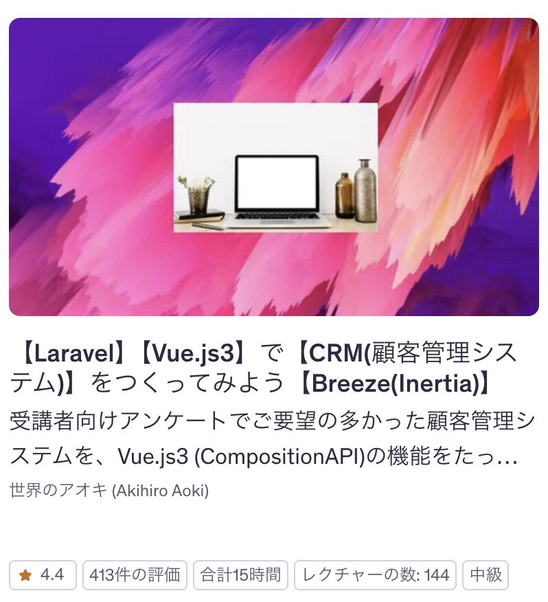 こちらの講座はLaravelとVue.jsを活用して顧客管理スステムを作る講座です。