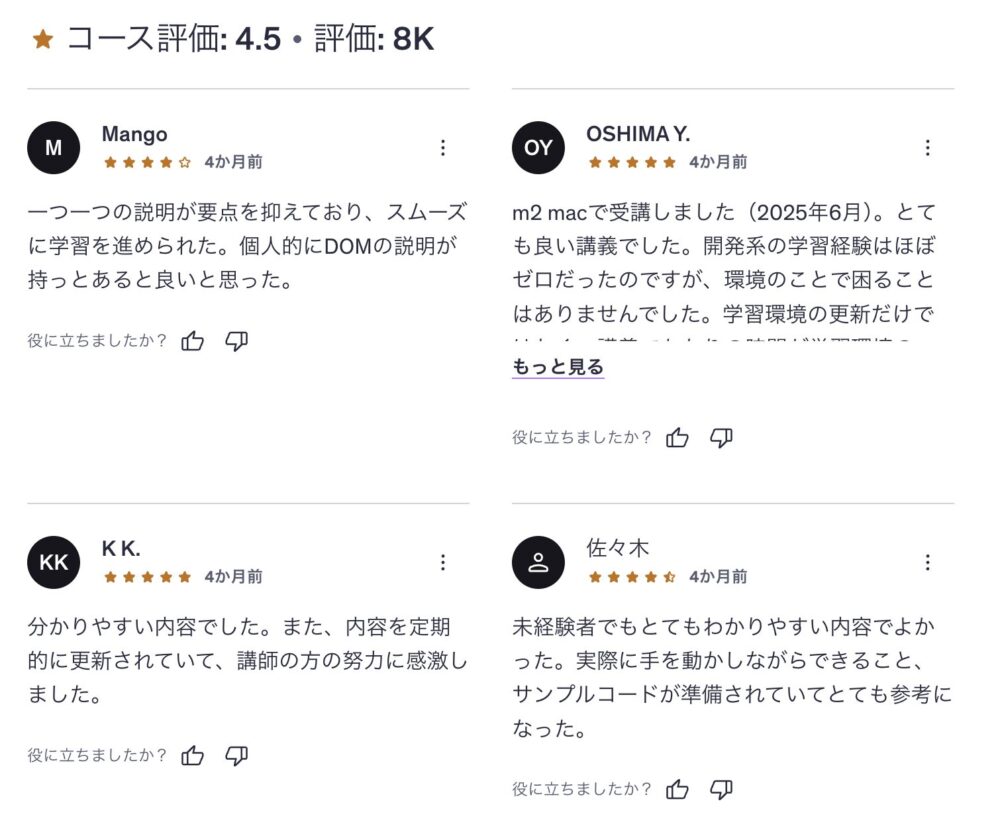 評価が4以上の高評価で、1,000人以上の購入者がいる人気講座だけを厳選しました。